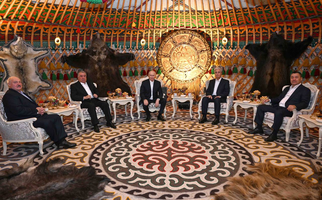 Президент Садыр Жапаров ЖККУга мүчө мамлекеттердин башчыларына кыргыз элинин сый-урматынын жана меймандостугунун символу катары колго жасалган панно ж...